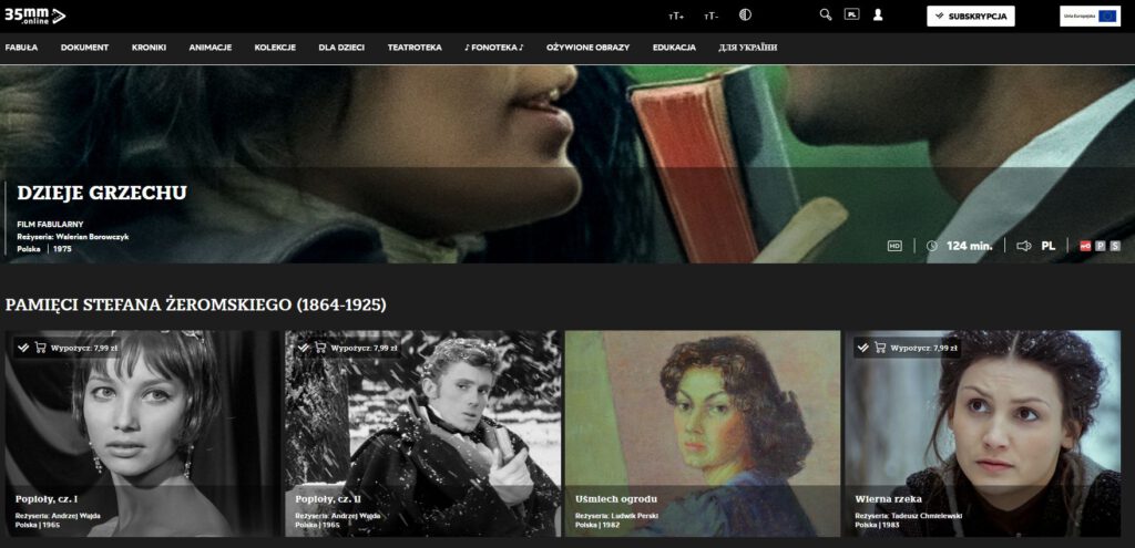 Także darmowa platforma, tyle że polska i wypełniona polskimi materiałami. To tam trafiają zrekonstruowane i odzyskane wersje polskich filmów przedwojennych. Oprócz fabuły można obejrzeć stare polskie filmy dokumentalne, zapisy teatralne i dużo innych rzeczy! Ogólnie to onlajnowa biblioteka dla wszystkich z zasobów Filmoteki Narodowej. Cena? Za darmo.
